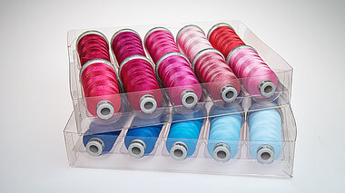 Die Garne werden in einer großen Farbpalette, inklusive Multicolour- und Neonfarben angeboten. Sie können so den Nuancen verschiedenster Stoffe angepasst werden oder intensive Kontraste hervorrufen. Polyestergarne verfügen über eine hohe Farbechtheit und sichern so den Erhalt der Stickerei.