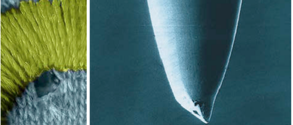 Entsprechend werden für Stickanwendungen sogenannte „Verdrängungsspitzen“ eingesetzt, auch als Kugel- oder Rundspitzen bezeichnet. Sie unterscheiden sich in ihrer Größe und Ausprägung. Der Einfachheit halber verwenden wir hier den Begriff „Rundspitze“. Rundspitzen mit kleiner Kugel verdrängen weniger Stoff als Rundspitzen mit großer Kugel.