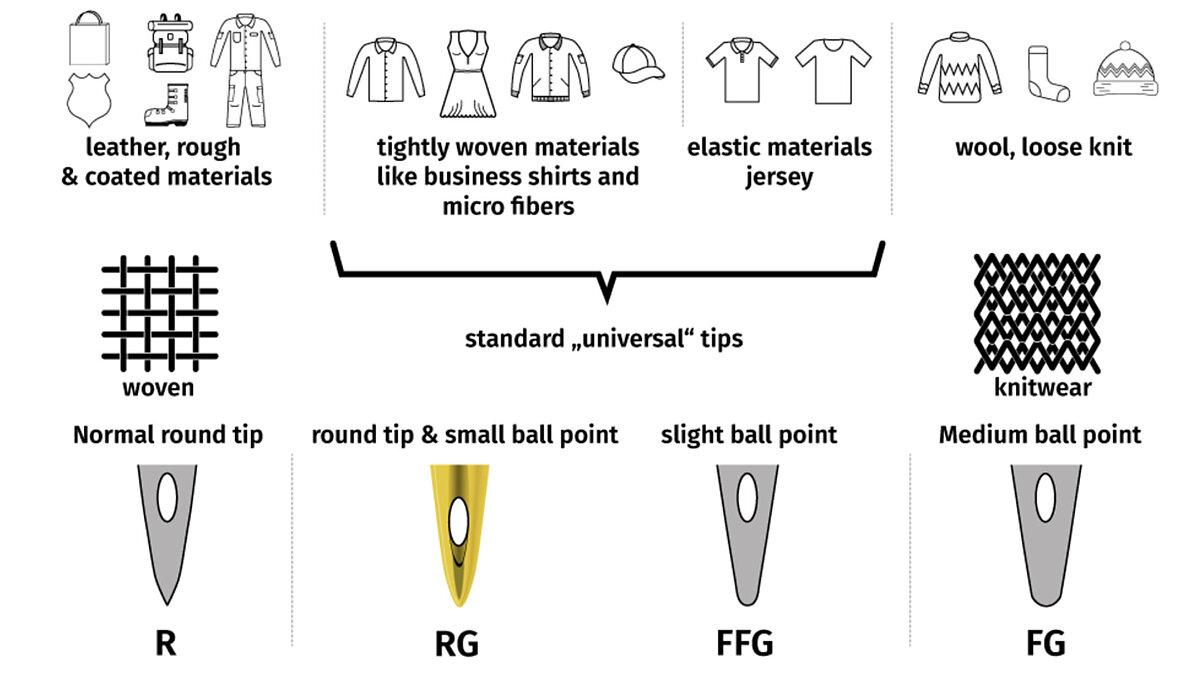 Handelt es sich beispielsweise um einen dicht gewebten, festen Stoff, kann die falsche Nadel schnell zu Wellenbildung oder Löchern im Material führen. Man verwendet in dem Fall eine möglichst „spitze“ Nadel, - hier: Rundspitze mit kleiner Kugel (RG) - die leicht durch den Stoff dringen kann.