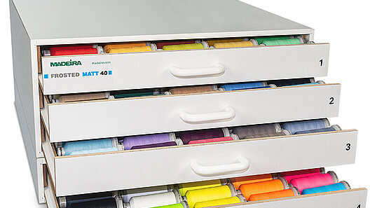 Most of our premium-quality embroidery threads are available as starter kits in three sizes or as assortment boxes. A starter kit offers you a comprehensive selection of the most beautiful threads and colours, often with corresponding bobbin threads and needles. The assortment boxes are the perfect tool for colour matching and sampling as you get all thread colours on full 1000m Mini Snap Cones (MSC).