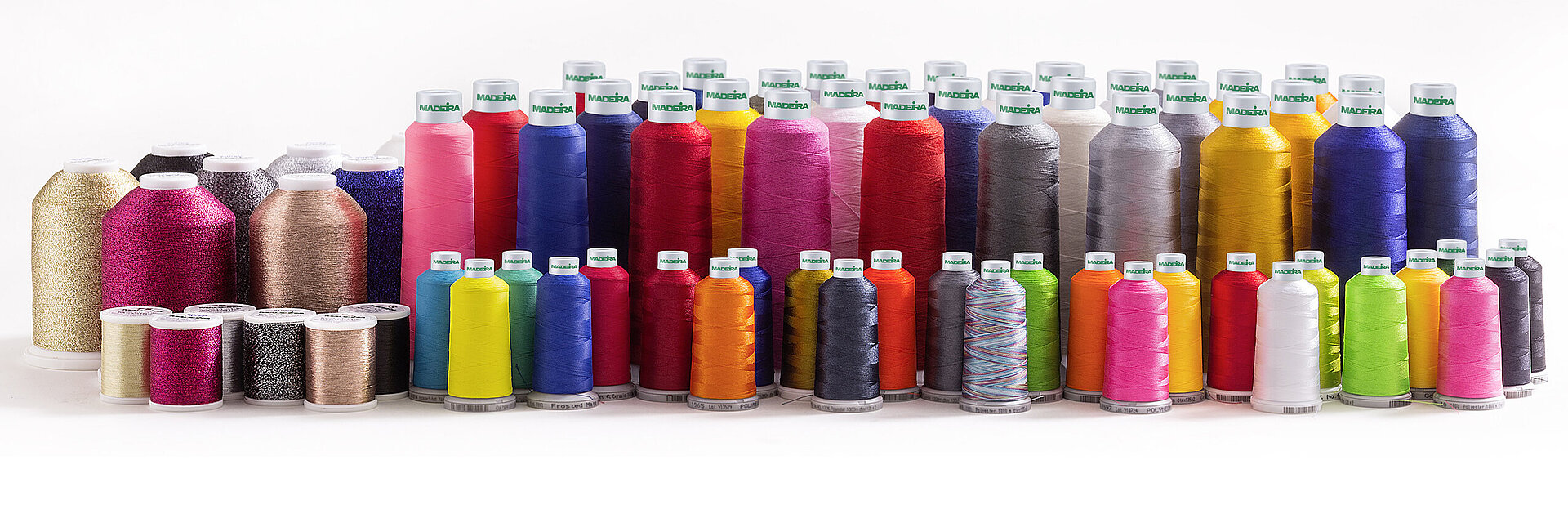Madeira ofrece las dos posibilidades: canillas preparadas y conos grandes con hilos de poliéster resistentes, finos y sin pelusas que puede combinar con cualquier hilo superior, independientemente de cuál sea su composición y grosor.